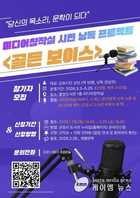 (케이엠뉴스) 군포시 중앙도서관은 시민이 직접 참여하는 낭독 콘텐츠 제작을 통해 공공 문화콘텐츠를 확산하고, 시민의 창작 경험을 지원하기 위해 미디어창작실 시민 낭독 프로젝트 '골든 보이스'를 운영한다.