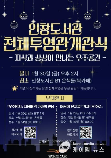 (케이엠뉴스) 구리시는 오는 1월 30일 오후 2시 인창도서관 지하 북카페에서 주요 내빈이 참석한 가운데 4층 야외에 조성된 인창도서관 천체투영관 개관식을 개최한다고 밝혔다.