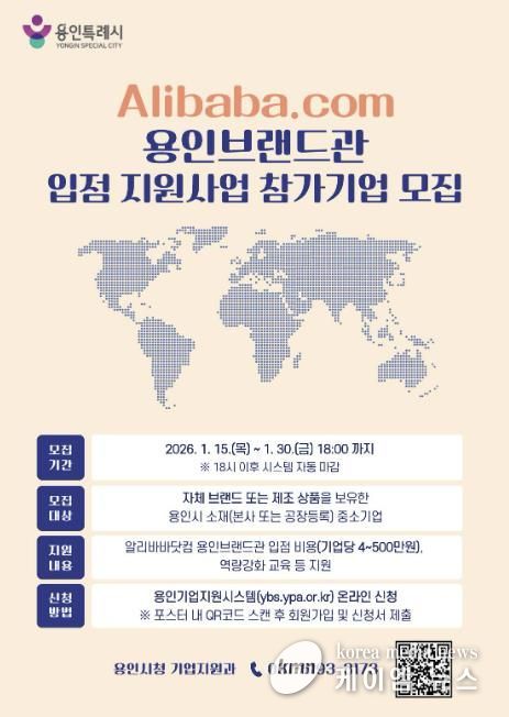 (케이엠뉴스) 용인특례시는 오는 1월 30일까지 B2B(기업 간 거래) 플랫폼 알리바바닷컴 내 ‘용인브랜드관’(YoGo) 입점 참가기업을 모집한다고 20일 밝혔다.