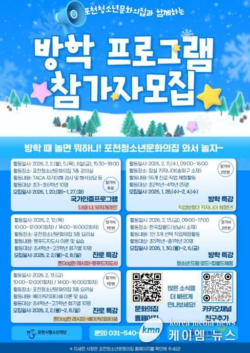 (케이엠뉴스) 포천시청소년재단이 운영하는 포천청소년문화의집은 청소년들의 진로 탐색과 창의 역량 강화를 위한 겨울방학 프로그램 참가자를 모집한다.