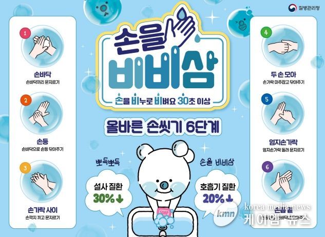 올바른 손 씻기는 감염병 예방을 위한 가장 쉽고 효과적인 방법으로, 흐르는 물에 비누로 30초 이상 손을 씻으면 최근 유행 중인 인플루엔자와 노로바이러스 등 장관감염증과 호흡기 감염병 예방에 큰 효과가 있다.
