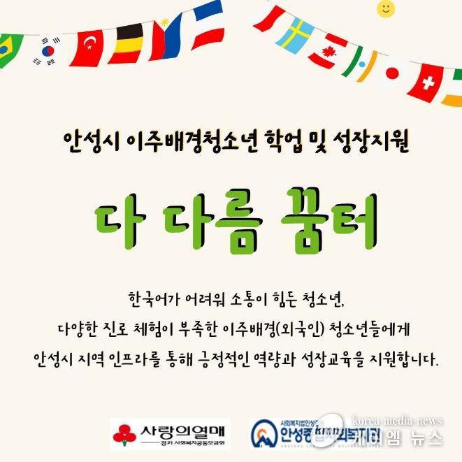 (케이엠뉴스) 안성종합사회복지관은 경기사회복지공동모금회 지원으로 이주배경(외국인) 청소년 대상 학업·사회적응 지원사업 ‘다다름 꿈터’ 참여자를 1월 28일까지 모집한다.