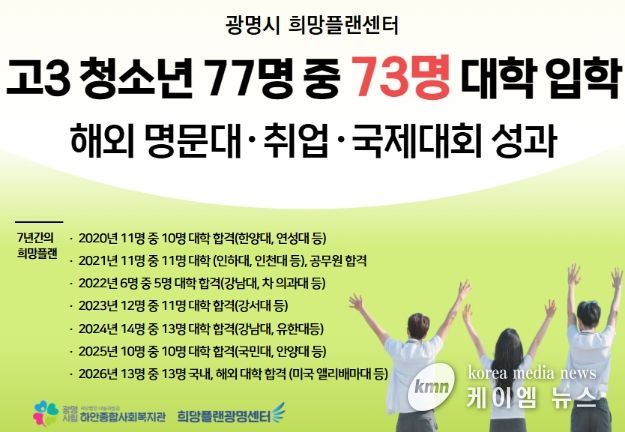 그 결과 2020년부터 2026년까지 희망플랜광명센터를 통해 지원받은 77명의 고등학교 3학년 청소년 가운데 73명이 대학에 합격했다. 취업 성공과 전문 분야 진출, 국제대회 입상 등 다양한 성과도 나타났다.
