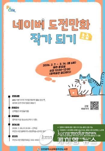 2월 강좌는 중학생 이상 청소년을 대상으로 디지털드로잉 실습 후 네이버 도전 만화에 업로드하는 ‘네이버 도전 만화 작가 되기’를 운영하며, 신청은 1월 28일부터 주안도서관 누리집에서 할 수 있다.