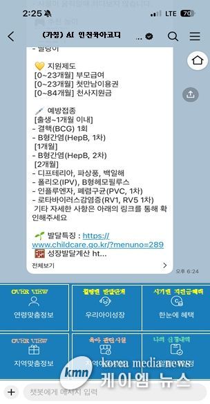 이에 인천시는 카카오톡 기반 챗봇을 활용해 행정 절차와 예산 부담을 줄이는 동시에 연령과 거주 지역에 따른 맞춤형 육아 정보를 한눈에 확인할 수 있도록 제공할 계획이다.