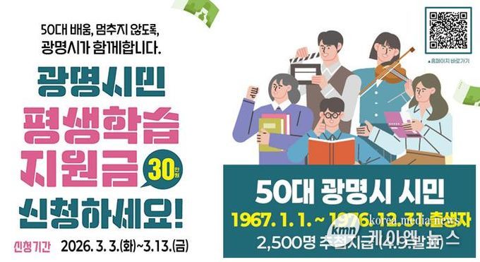 (케이엠뉴스) 광명시가 50대 중장년 시민의 배움 기본권 보장을 위해 올해도 평생학습지원금 지원을 이어간다.