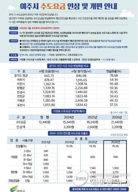 (케이엠뉴스) 여주시 수도사업소는 지난 2024년부터 추진해 온 ‘수도요금 현실화 3개년 계획’에 따라, 오는 2026년 3월 고지분부터 마무리 단계인 19.3% 인상을 시행한다고 밝혔다. 이번 인상은 만성적인 적자 구조를 탈피하고 시민들에게 보다 안전하고 깨끗한 수돗물을 공급하기 위한 조치다.