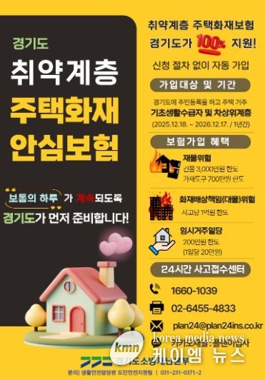 해당 보험은 경기도에 주민등록을 두고 주택(단독‧공동주택)에 거주 중인 기초생활수급자와 차상위계층 37만 9천여 가구를 대상으로 하며, 별도 신청 없이 자동 가입된다.