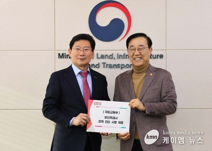(케이엠뉴스) 이상일 용인특례시장은 26일 정부세종청사에서 김윤덕 국토교통부 장관에게 ‘용인 첨단시스템반도체 클러스터 국가산업단지’ 정상 추진과 경기남부광역철도 ‘제5차 국가철도망 구축계획’ 반영 등 시의 주요 현안을 설명하는 자료를 건네고 국토교통부 지원과 협조를 요청했다.