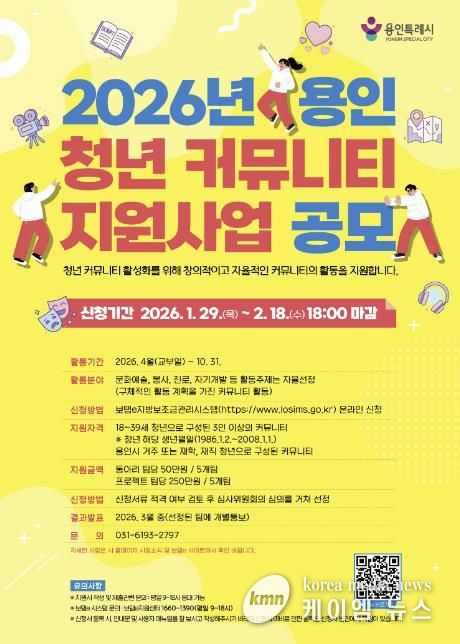 (케이엠뉴스) 용인특례시는 2월 18일까지 ‘청년 커뮤니티 지원사업’에 참여할 10개 팀을 모집한다고 29일 밝혔다.