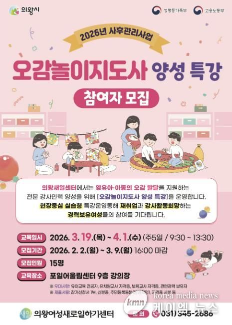 (케이엠뉴스) 의왕시 여성새로일하기센터가 '오감놀이지도사 양성 특강'의 교육생을 모집한다.
