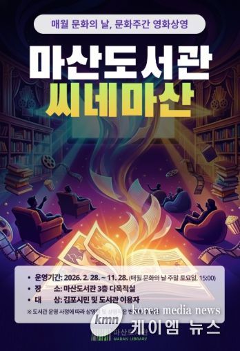 (케이엠뉴스) 김포시 마산도서관은 매월 문화의 날을 맞아 시민들이 일상 속으로 자연스럽게 문화를 향유 할 수 있도록 문화 주간 영화 상영 프로그램 ‘씨네마산’을 운영한다.