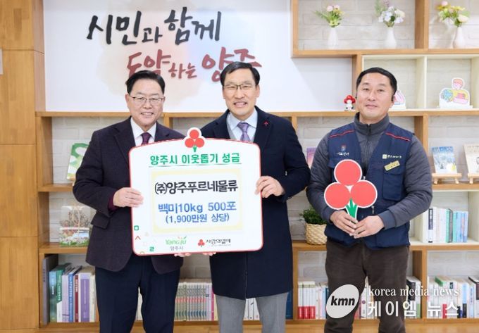 (케이엠뉴스) 양주시는 29일 ㈜양주푸르네물류로부터 이웃돕기 성품으로 백미 10kg 500포(1,900만 원 상당)를 기탁받았다고 밝혔다.