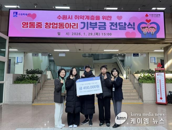 (케이엠뉴스) 수원 영통중학교 창업동아리 학생들이 창업 활동 수익금을 모아 수원시 취약계층 시민을 위해 기부했다.