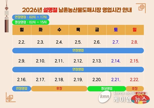 2월 2일부터 16일까지 기존 오후 3시였던 영업시간을 오후 5시까지 2시간 연장하고, 정기 휴무일인 2월 8일과 2월 15일에도 정상적으로 연장 운영해 장보기에 불편이 없도록 할 계획이다.
