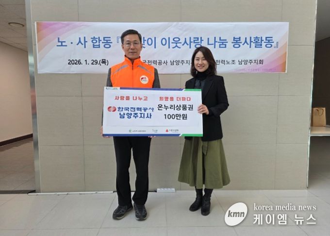 (케이엠뉴스) 남양주시는 지난 29일 한국전력공사 남양주지사가 설 명절을 맞아 취약계층 지원과 전통시장 활성화를 위해 온누리상품권 100만 원을 동부희망케어센터에 전달했다고 30일 밝혔다.