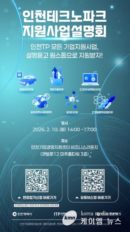 (케이엠뉴스) 인천테크노파크(인천TP)는 오는 2월 10일 송도 미추홀타워에서 인천 지역 중소기업을 대상으로 ‘2026 인천테크노파크 지원사업 설명회’를 개최한다고 밝혔다.