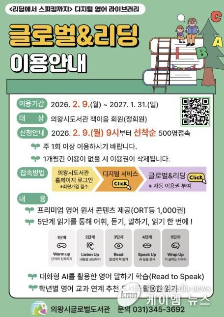 (케이엠뉴스) 의왕시 글로벌도서관(보식골로 30-10)이 아동, 청소년의 자기 주도적 영어 독서 습관 형성과 실력 향상에 도움을 줄 수 있도록 디지털 영어 라이브러리를 활용한 온라인 영어 독서 콘텐츠 '글로벌 앤 리딩'을 제공한다.