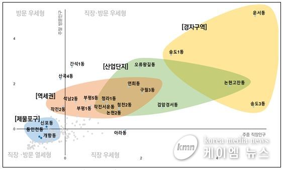 직장·방문인구 모두 많은 지역은 송도(4개 동), 영종(운서동), 청라(3개 동)와 부평(6개 동), 구월(5개 동), 주안(2개 동)으로 나타났는데, 공통적으로 교통접근성이 우수하고, 상업·업무·산업기능이 집적된 지역에 집중되는 경향을 보인다.