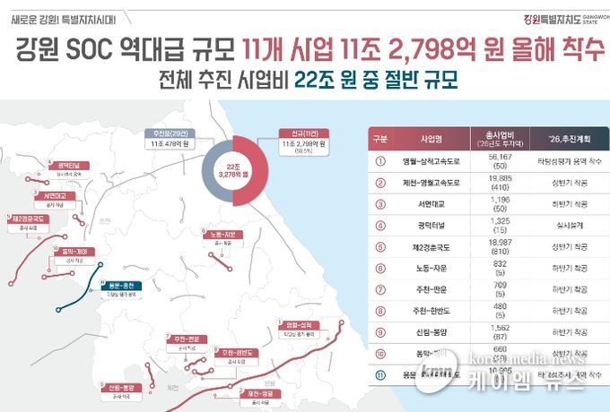 (케이엠뉴스) 강원특별자치도는 현재 추진 중인 SOC 교통망 사업 22조 원 가운데 절반이 넘는 11조 원 규모의 사업을 올해 본격 착수한다고 밝혔다.