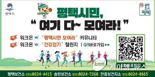 (케이엠뉴스) 평택시는 시민들의 건강증진을 위해 스마트폰 하나로 누구나 쉽게 참여할 수 있는 모바일 건강 커뮤니티 ‘평택시민 모여라(워크온)’을 활발히 운영 중이라고 밝혔다.