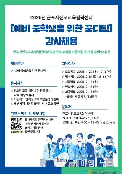 (케이엠뉴스) (재)군포시청소년재단 군포시진로교육협력센터는 관내 예비중학생의 학교 적응과 진로 기초 역량 강화를 위해 '2026년 군포시진로교육협력센터 예비중학생을 위한 꿈디딤' 프로그램에 참여할 강사를 채용한다고 밝혔다.