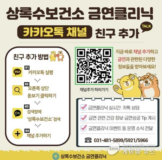 참여를 희망하는 지역 주민은 카카오톡 친구찾기에서 ‘상록수보건소 금연클리닉’을 검색하거나 큐알(QR)코드를 통해 채널을 추가한 후 상담 서비스를 이용할 수 있다. 구체적인 상담이나 금연 보조제가 필요한 경우에는 상록수보건소 3층에 소재한 금연클리닉을 방문해 대면 상담을 병행할 수 있다.