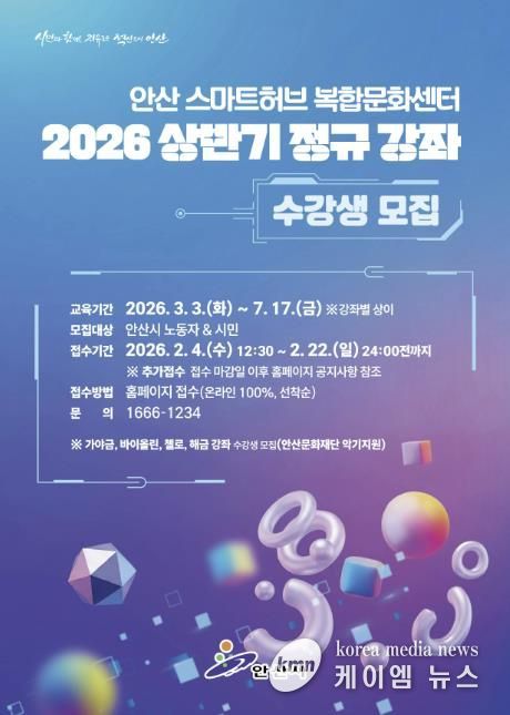 (케이엠뉴스) 안산시 스마트허브복합문화센터는 오는 4일부터 상반기 정규강좌 수강생을 모집한다고 3일 밝혔다.