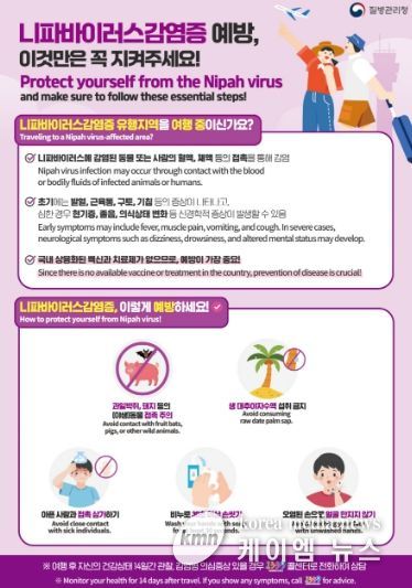 감염 예방을 위해서는 △비누로 30초 이상 손 씻기 △과일박쥐, 돼지 등 야생동물과의 접촉 피하기 △생 대추야자수액 등의 음료, 바닥에 떨어진 과일 섭취 자제 △환자와의 직접 접촉 피하기 등의 수칙을 지켜야 한다.