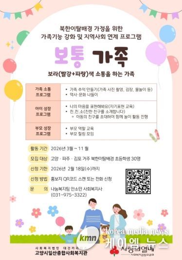 (케이엠뉴스) 고양시일산종합사회복지관이 북한이탈배경 가정의 가족기능 강화 및 지역사회 통합 프로그램 ‘보통 가족’의 참여자를 이달 18일까지 모집한다.