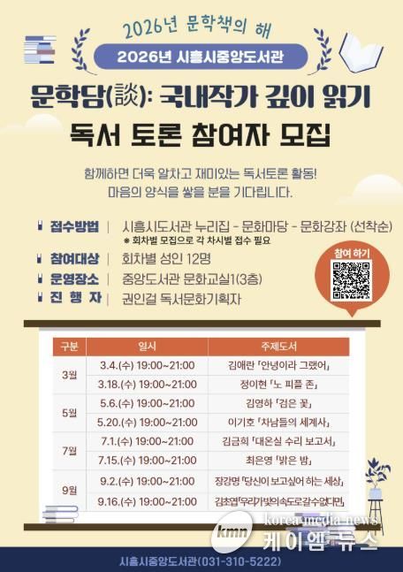 (케이엠뉴스) 시흥시중앙도서관은 ‘2026년 문학책의 해’를 맞아 국내 대표 문학 작가 소설을 주제로 한 독서토론 ‘문학담(談): 국내 작가 깊이 읽기’를 오는 3월부터 9월까지 운영한다.