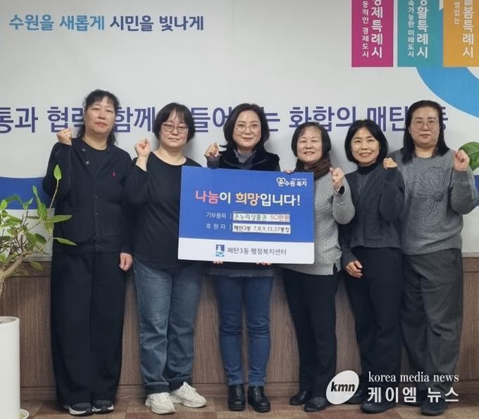 (케이엠뉴스) 수원시 영통구 매탄3동은 지난 3일 매탄3동 7, 8, 9, 13, 37통장 일동이 설 명절을 맞아 관내 어려운 이웃들에게 온누리상품권 50만원을 기부했다고 밝혔다.