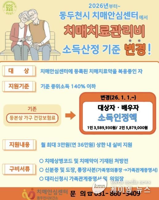 (케이엠뉴스) 동두천시 치매안심센터는 2026년 1월 1일부터 치매치료관리비 지원사업의 소득 산정 기준이 변경된다고 3일 밝혔다.