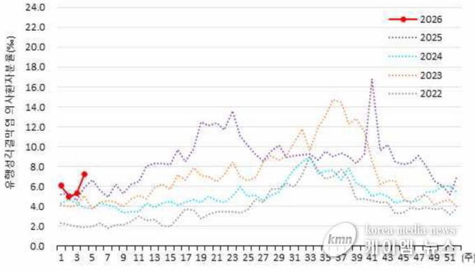질병관리청 표본감시 자료에 따르면, 1월 넷째 주 유행성결막염 의사환자 분율은 인구 1,000명당 7.2명으로 집계됐다. 이는 전주(5.3명)보다 증가한 수치로, 2022년부터 2025년까지 최근 4년간 같은 기간과 비교해도 가장 높은 수준이다.