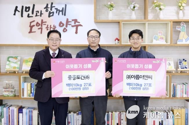 (케이엠뉴스) 양주시가 지난 3일 시장실에서 중흥토건㈜과 ㈜아름이앤씨로부터 이웃돕기 성품으로 백미 10kg 54포(200만 원 상당)를 기탁받았다.