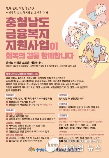 도와 충남신용보증재단은 충남금융복지상담센터를 운영해 금융복지 지원사업을 진행할 계획으로, 센터에서는 상담을 통해 개인회생, 파산, 신용 회복, 새출발기금 등 맞춤형 채무조정 제도를 안내하며 서류 준비 등 복잡한 신청 절차를 지원한다.