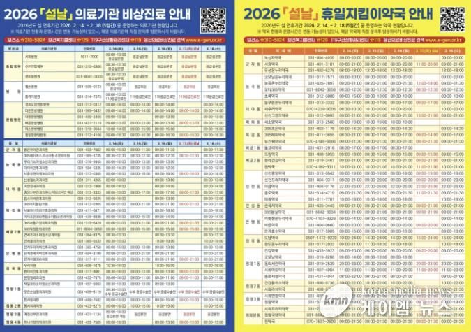 (케이엠뉴스) 시흥시는 설 명절 연휴 기간인 2월 14일부터 18일까지 5일간, 의료기관과 약국 휴무로 인한 시민의 불편을 최소화하고자 설 명절 기간 문 여는 의료기관과 약국, 소아 취약지 의료기관과 공공심야약국을 운영한다.