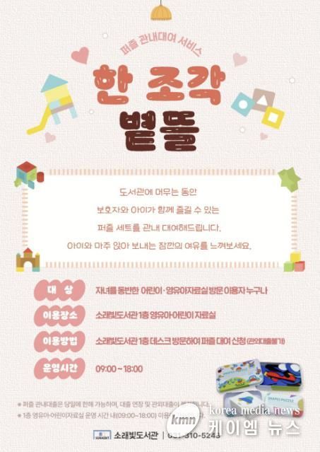 김혜순 소래빛도서관장은 “‘한 조각 볕뜰’은 아이들이 한자리에 머물며 차분히 몰입할 수 있는 시간을 제공하고자 기획한 서비스”라며, “부모와 아이가 함께 퍼즐을 맞추며 도서관에서의 경험이 더 깊어지길 기대한다”라고 말했다.
