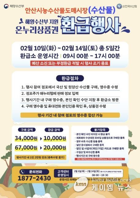 (케이엠뉴스) 안산시는 설 명절을 맞아 국산 수산물 소비 촉진과 도매시장 활성화를 위해 오는 10일부터 14일까지 5일간 ‘2026년 설 온누리상품권 환급행사’를 개최한다고 5일 밝혔다.