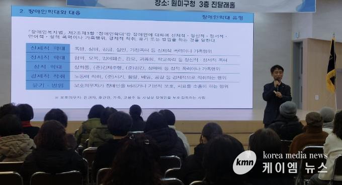 (케이엠뉴스) 부천시는 지난 3일 부천시장애인인권센터와 함께 원미구청 진달래홀에서 ㈜햇빛나눔 소속 활동지원사 200여 명을 대상으로 ‘장애인활동지원사와 장애인 인권’을 주제로 교육을 실시했다.