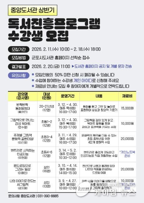 (케이엠뉴스) 군포시 중앙도서관은 다가오는 3월 시민들의 독서역량 개발과 지속적인 독서활동을 고취하기 위해 상반기 독서진흥프로그램을 운영한다.
