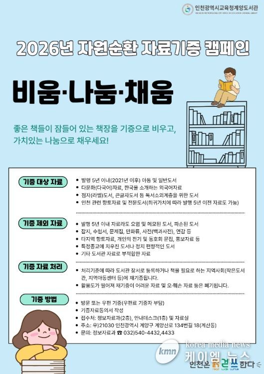 (케이엠뉴스) 인천광역시교육청계양도서관은 시민과 지역사회가 함께하는 자원순환형 독서문화 확산을 위해 2026년 자료기증 캠페인 ‘비움·나눔·채움’을 연중 운영한다고 5일 밝혔다.