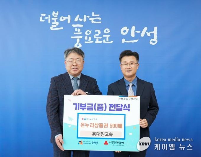 (케이엠뉴스) 안성시는 2월 3일 대원고속으로부터 지역의 어려운 이웃을 돕기 위한 온누리상품권 500매(500만 원 상당)를 전달받았다고 밝혔다.