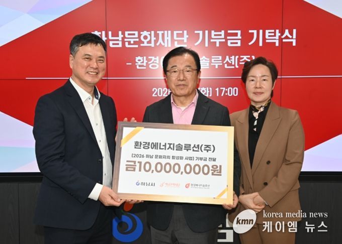 (케이엠뉴스) (재)하남문화재단은 2월 4일, 하남시청에서 환경에너지솔루션㈜으로부터 문화자치 활성화를 위한 기부금 1천만 원을 전달받았다고 밝혔다. 이날 기부식에는 이현재 하남시장을 비롯해 기업 및 재단 관계자들이 참석해 지역 상생과 ESG 실천의 의미를 공유했다.