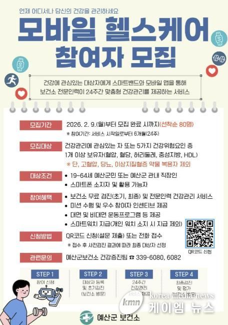 (케이엠뉴스) 예산군 보건소는 오는 9일부터 ‘2026년 모바일 헬스케어 사업’ 참여자 80명을 선착순 모집한다.