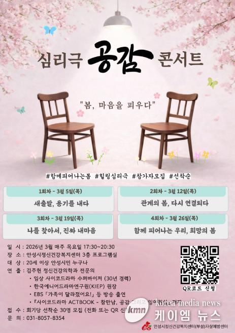 (케이엠뉴스) 안성시보건소 안성시정신건강복지센터(부설 자살예방센터)는 시민의 정신건강 증진과 생명존중 문화 조성을 위해 심리극(사이코드라마) 기법을 활용한 체험형 집단 프로그램 '공감' 콘서트를 오는 3월 운영한다고 밝혔다.
