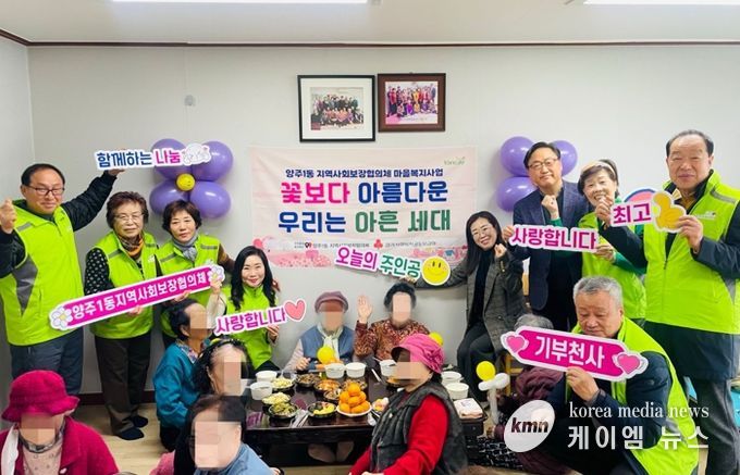 (케이엠뉴스) 양주시 양주1동은 지역사회보장협의체가 최근 정서적 고립감을 느끼는 산북4통 90세 이상 어르신들을 대상으로 경로당에서 '꽃보다 아름다운 우리는 아흔 세대' 사업을 추진했다고 밝혔다.