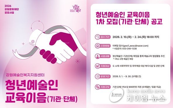 (케이엠뉴스) 강원문화재단은 도내 청년예술인의 안정적인 활동 기반을 조성하고 문화예술의 사회적 가치를 확산하기 위해 '2026년 청년예술인 교육이음 사업' 공모를 추진한다.