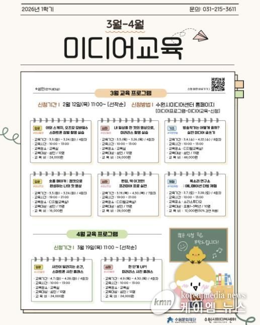 (케이엠뉴스) 수원문화재단 수원시미디어센터는 다가오는 봄, 시민들의 미디어 제작 역량을 깨우기 위한 2026년 3~4월 미디어 교육을 개설하고 수강생 모집에 나선다.