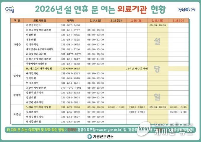 아울러 가평군은 설 연휴 동안 운영하는 의료기관, 약국 정보를 사전에 안내하고 있다. 연휴 기간 문을 여는 의료기관 및 약국 정보는 △가평군청 및 가평군보건소 홈페이지 △119구급상황관리센터 △응급의료포털 △보건복지콜센터에서 확인할 수 있다.